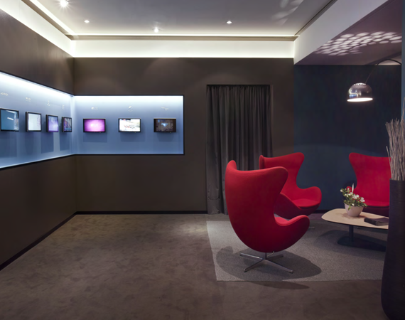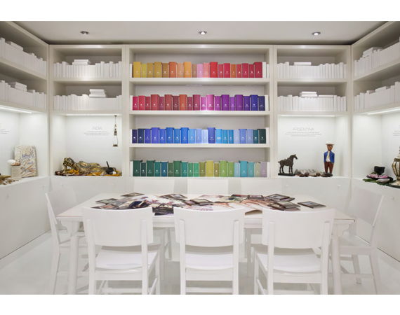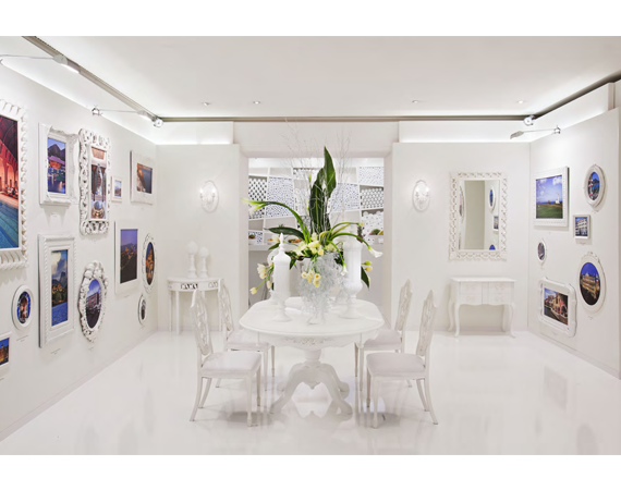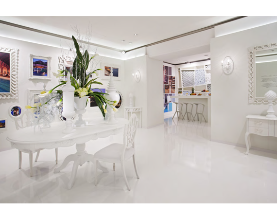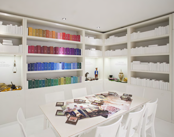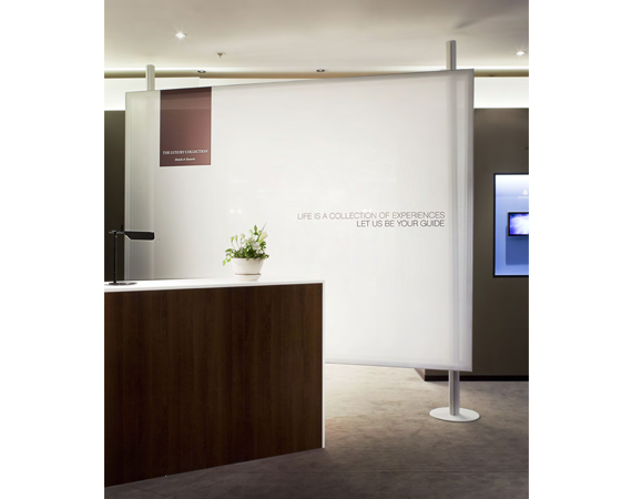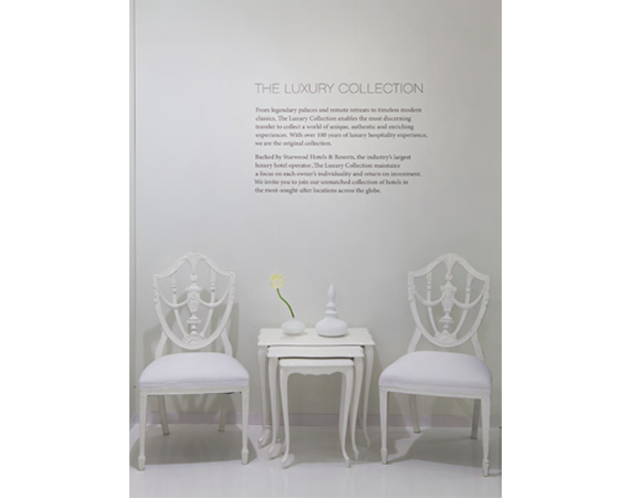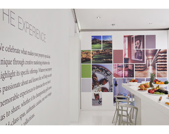 The space's design, inspired by art museums and galleries, was based on the Luxury Collection brand's aesthetic. A blank white canvas sectioned in design to express the LC design genres of Palace, Modern and Resort were the perfect setting for the brand's passion points to each be expressed through color, image and word.