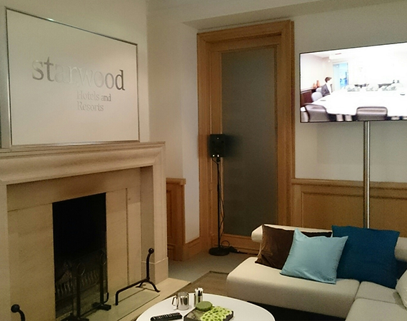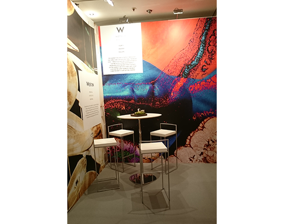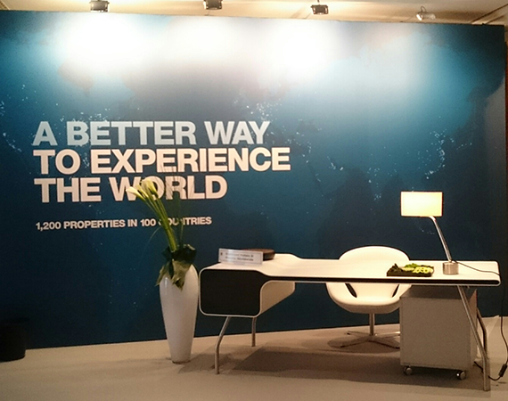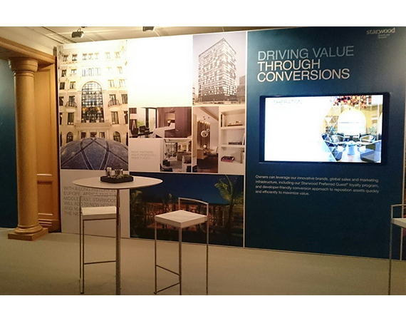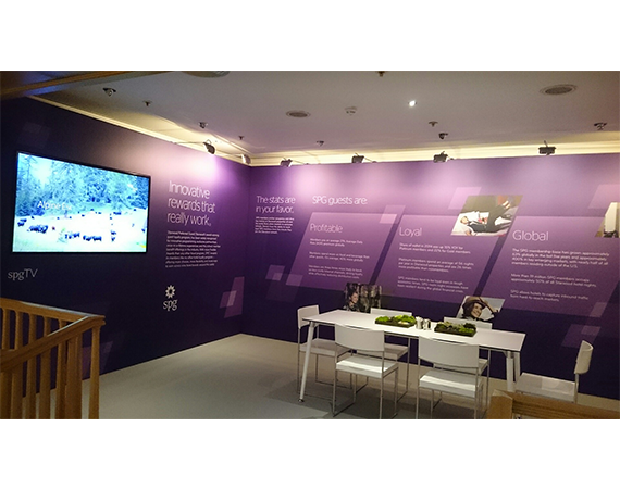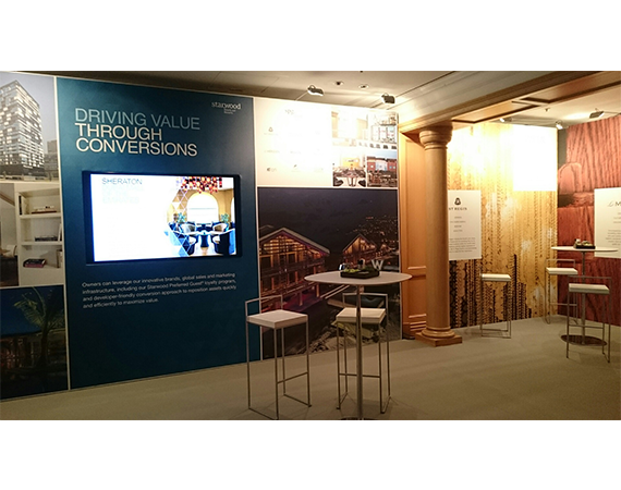 The space's design consisted free standing wall with large format graphics that told the Starwood story to owners, developers and guests of the Starwood suite.