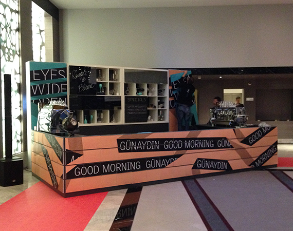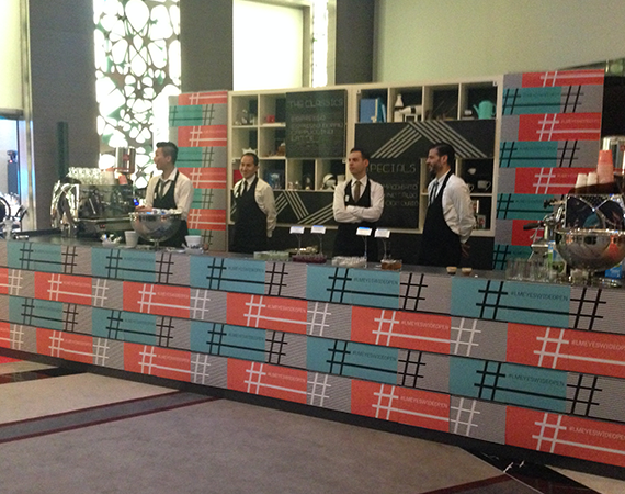 The environmental elements framed the LM brand's new visual identity. The stage graphics changed every day, with each day framing the day's message. The highlight was the transformational bar that came about as a lack of time for the theme changes required for the themed breaks. The bar's facade consisted of tearoff pads that had the day's graphics printed on them. With a short time between breaks the staff would tear off the sheets completely transforming the look and theme of the bar in minutes.