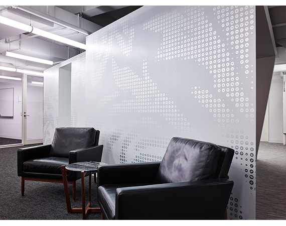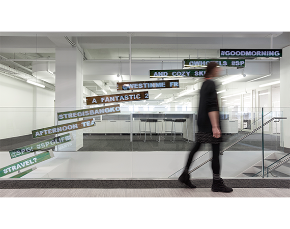 The space cover 2 floors featuring an internal, glass interconnecting staircase, a custom digital chandelier live streaming the SPG twitter feed, a frame gallery live straming Instagram content for SPG, Le Meridien, St. Regis, W Hotels and Luxury Collection and a magic mirror at the 10th reception area that shows branded video content, static branded images and additional live streaming social media.