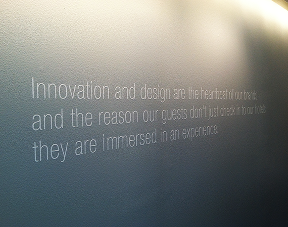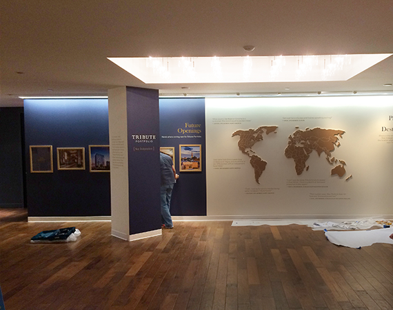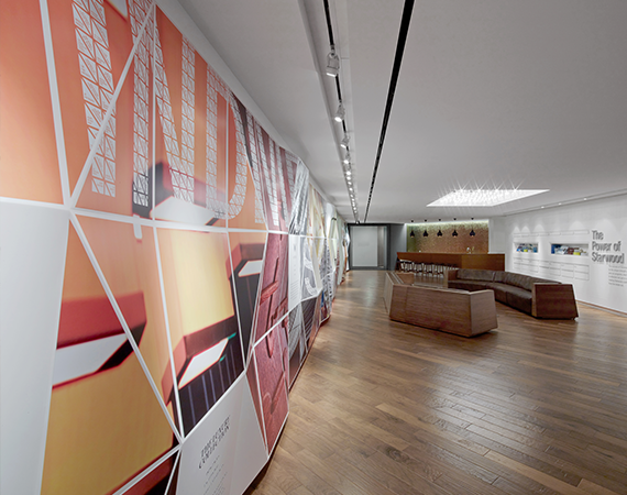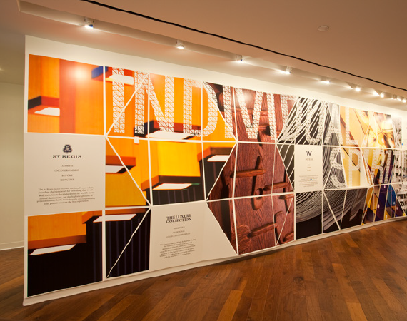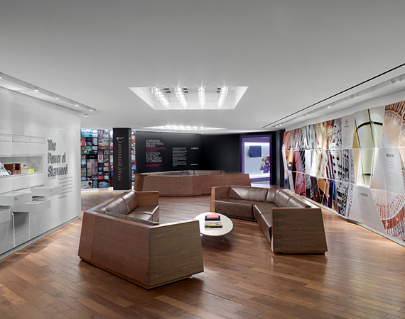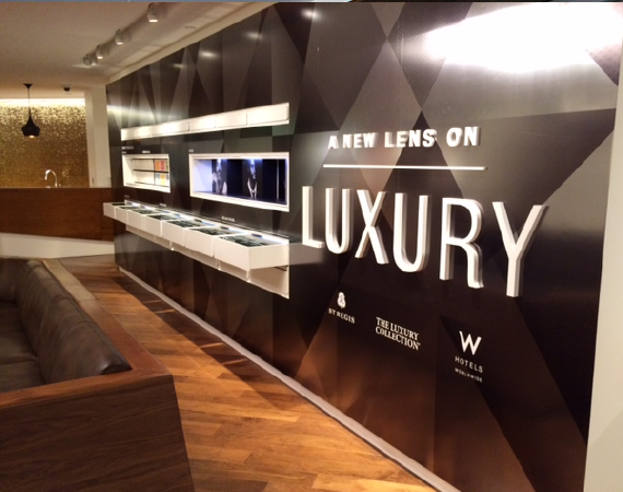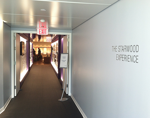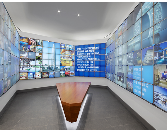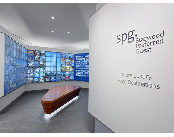 The entrance to the STARWOOD EXPERIENCE on the second floor guests will enter the Branded spaces by passing through the SPG Tunnel. Since SPG is the way in which guests are introduced to most of our brands, Starwood believed this was the best way for their guests to enter the 2nd Floor of The Starwood Experience. The SPG Tunnel is much more than a hallway; it is a space that showcases the innovative programming of SPG. One wall features SPG member stories as they share their travel experience. Additionally, on the other wall on display are the partnerships that help make exclusive programs like SPG Moments possible and an opportunity for guests to see SPGtv which plays in all our guestrooms worldwide. After passing through the SPG tunnel, guests enter the public space of the The Starwood Experience. There are four distinct installations that include the 40-foot Articulated Wall which features the story of each of the brands. Through the lens of individual spirit and collective strength, each brand showcases it's core values and brand experiences. This space was desgned to be refreshed on an annual basis reflecting the changing and evolving brand programming.)Across the room, the Showcase are two walls made of corian that includes a unique drawer & shelving systems that provides an opportunity to tell stories through physical elements and graphics. On the first wall, guests can view the “Brand Storytelling” exhibit that explores each of brand’s unique experiences through their specific brand experiences and design direction. This installation allows each brand to utilize their branded elements through the unique exhibit tools of the Showcase to show the power of storytelling. On the second wall in the Showcase, is featured an installation called “The Power of Starwood”. This installation showcases the success of our Starwood programs which cross brands, divisions and hotels.