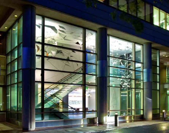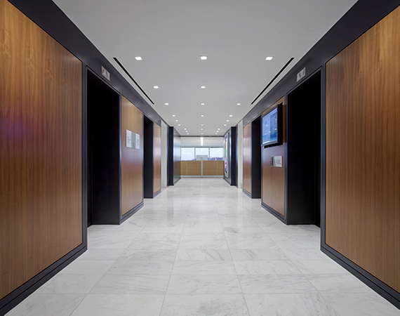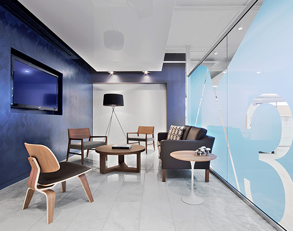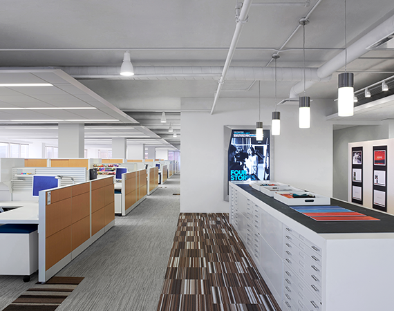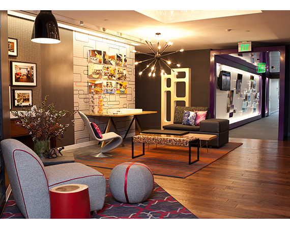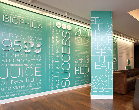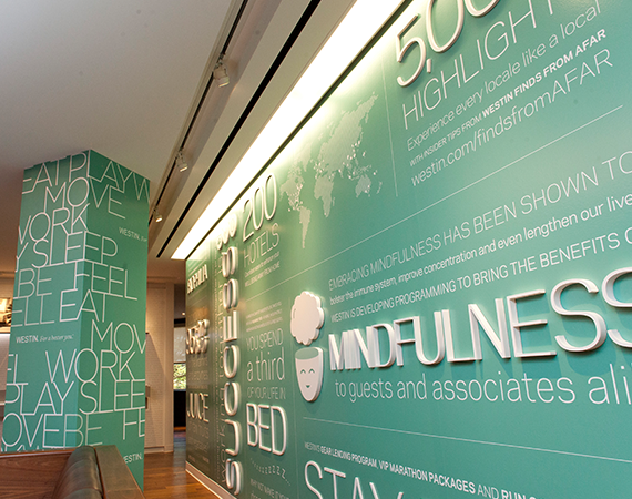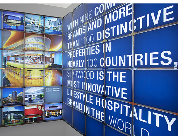 One of the unique features of the Starpoint Headquarters facilities is the Starwood Experience space. The Starwood Experience space showcases Starwood's lifestyle brands, their global corporate programs and brand initiatives through engaging and emotional design. As you enter The Starwood Experience, the first image that guests see is the core belief statement which is engraved into corian (stone), "A BETTER WAY TO EXPERIENCE THE WORLD". Guests can relax while waiting for their meeting in front the LED Wall, a unique way to learn about different news events happening around the world with Starwood. (These messages are updated weekly and daily). While guests are in the lobby space, they have the opportunity to learn about Starwood's global strength through the Global Gallery. This is a 5-panel installation that showcases some of the unique and engaging new hotel properties around the world from Austin to Abu Dhabi from Beijing to Bogota from London to Lhasa. As guests transition from the 1st floor lobby to the 2nd floor by way of a two-level staircase, they can see an artistic sculpture above hanging from the ceiling of the Starwood star which has burst into the many pieces that make up THE STARWOOD EXPERIENCE.