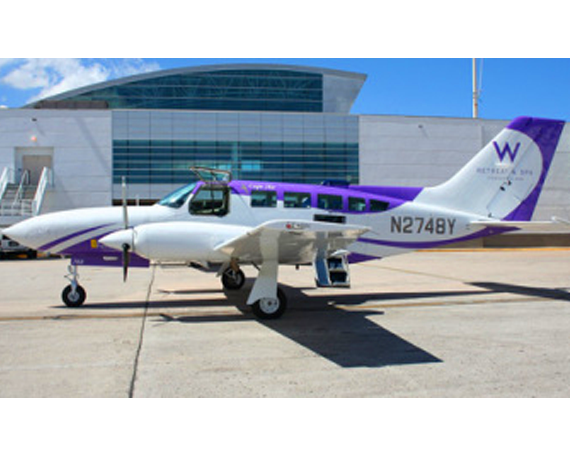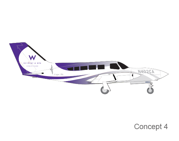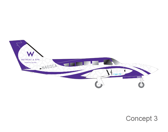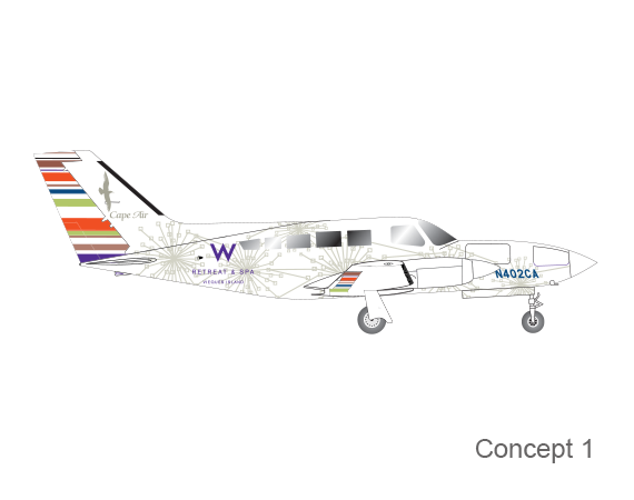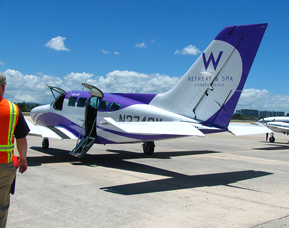 The commuter carrier Cape Air airplane is a nine-passenger Cessna 402 wrapped in the colors of the W Retreat & Spa-Vieques Island, Puerto Rico. The co-branded aircraft offered W Hotels an opportunity to promote the W Vieques resort.